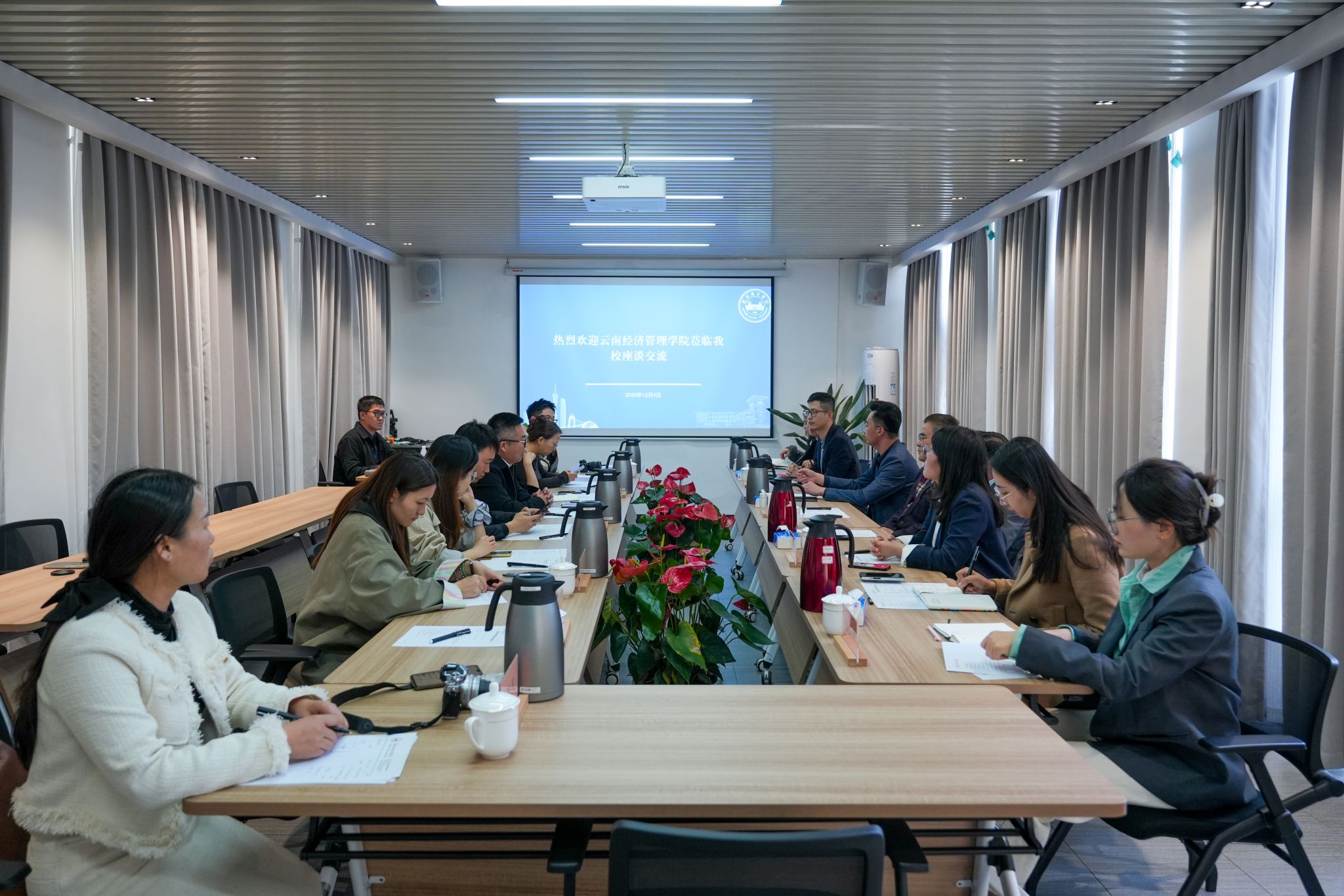 12月4日下午,云南经济管理学院校长助理者胜祥一行来访beat365,双方围绕高水平应用型大学建设、学校品牌体系建设与传播、招生工作创新等议题开展交流。beat365平台唯一官网党委副书记植秀聪、校长助理蒋玮、汪文平等校领导及相关职能部门负责人出席交流活动。
