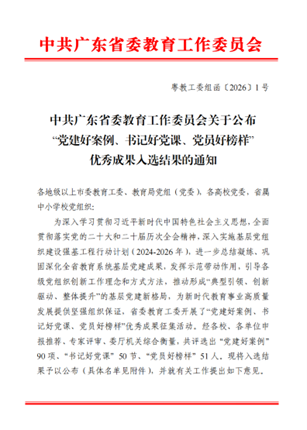 据悉,此次“党建好案例、书记好党课、党员好榜样”优秀成果评选由广东省委教育工委主办,旨在进一步总结凝练、巩固深化全省教育系统基层党建成果,集中展现近年来全省教育系统基层党建工作的丰硕成效与党员队伍的良好精神风貌。经各校、各单位申报推荐、专家评审、委厅机关综合衡量,共评选出“党建好案例”90 项、“书记好党课”50节、“党员好榜样”51人。