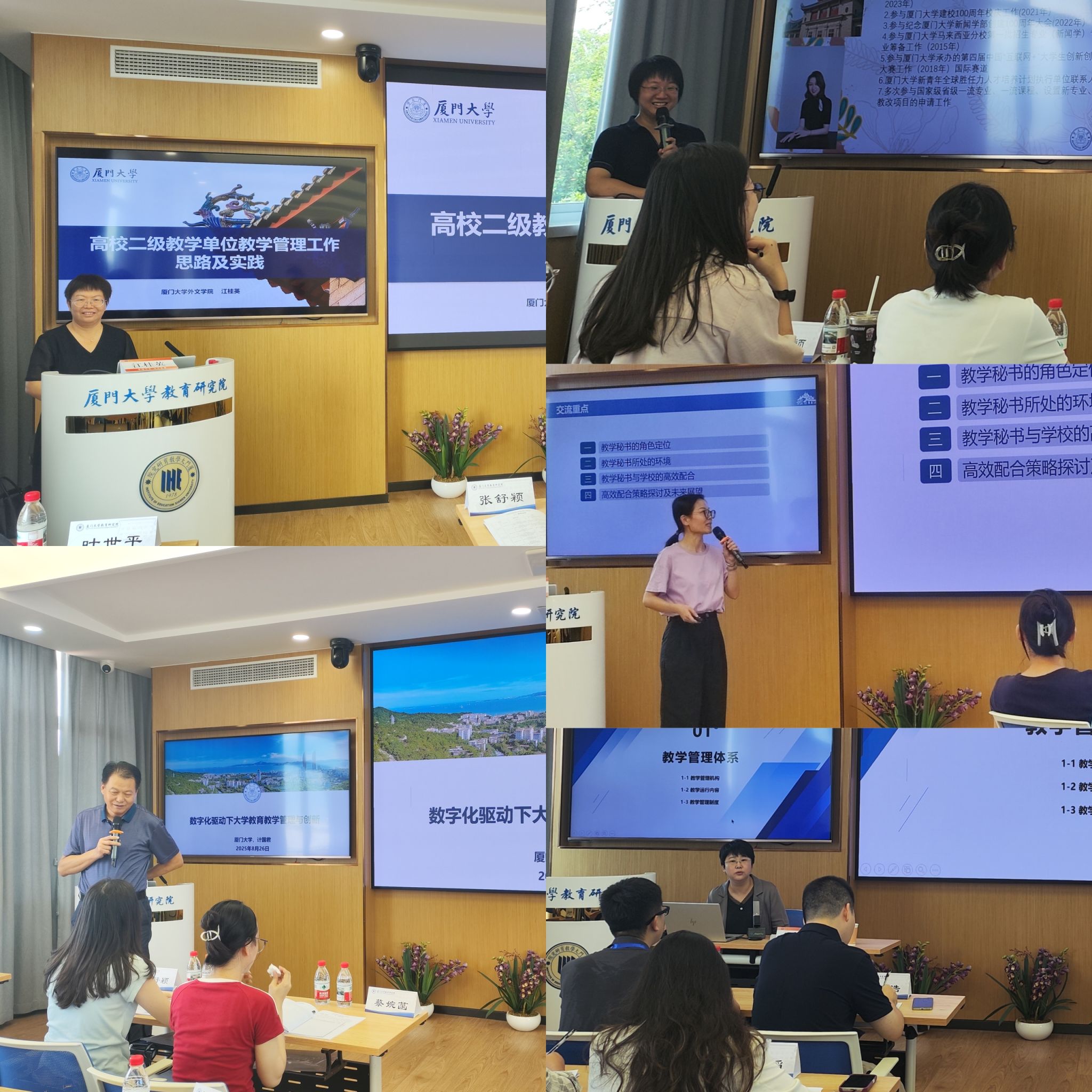 培训特邀多位专家学者与资深教学管理人员进行专题授课。厦门大学教师发展中心主任计国君教授以“新时代大学教育教学管理设计与创新”为题,深入探讨了数字化背景下教学管理的新趋势与实践路径。厦门大学外文学院江桂英教授结合本科教学管理实务,系统讲解了教学秘书工作的核心要素与院校协同机制。厦门华夏学院教务处常务副处长吴三萍分享了民办高校合格评估迎检与教学质量保障体系建设的经验。厦门大学新闻传播学院教学秘书李鑫则从一线工作实际出发,针对常见问题与难点,阐述了教学秘书的核心职责与跨部门沟通技巧。