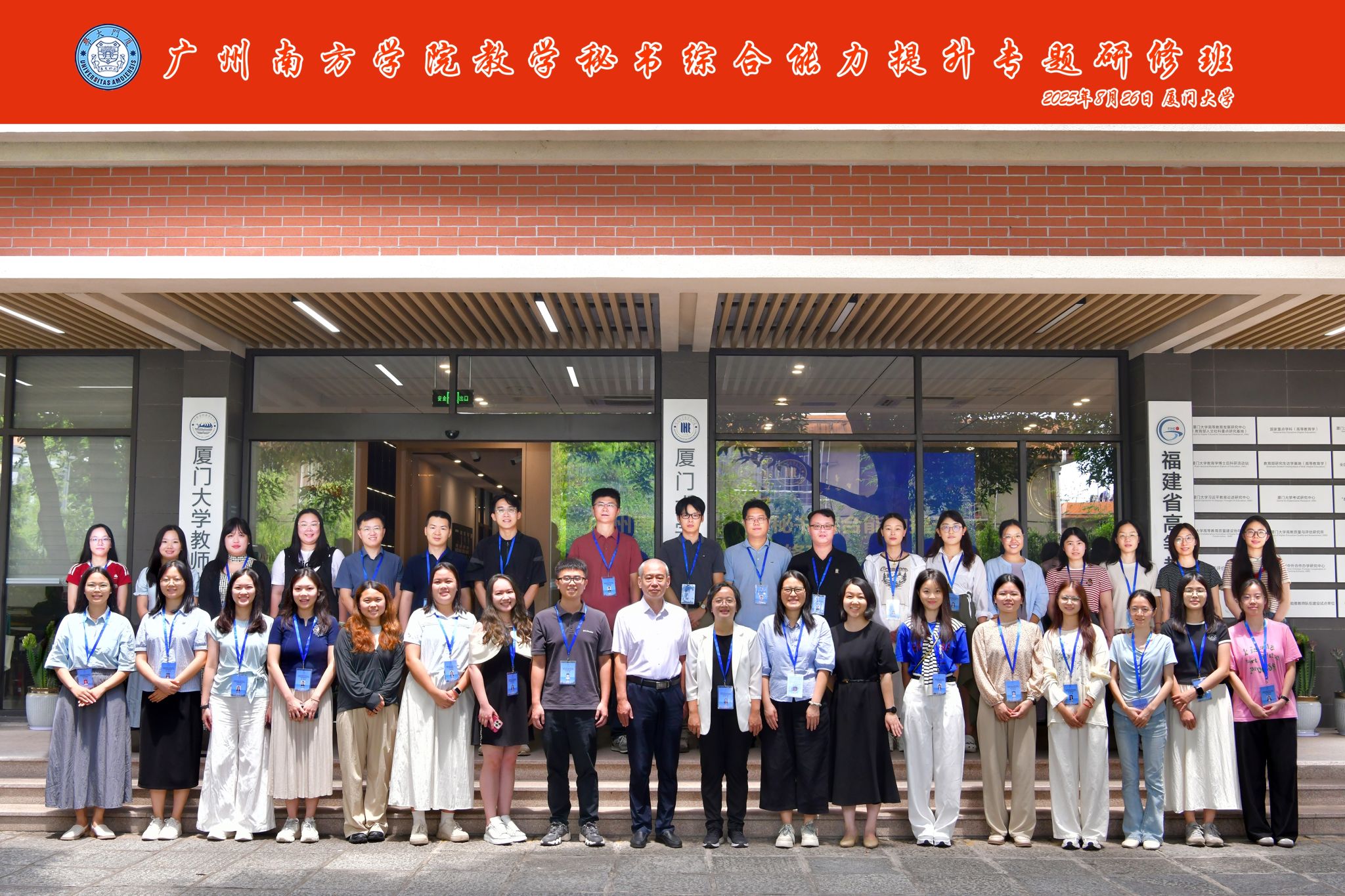 2025年8月25日至29日,beat365平台唯一官网教学秘书综合能力提升专题研修班在厦门大学顺利举行。本次研修班由教务处处长钟肖英教授带队,教务处、教学质量评建与督导办公室等有关人员以及各教学单位教学秘书共计35人参加培训。培训紧密结合实际工作需要,系统设计课程内容,旨在进一步增强教学秘书的综合素养与服务效能。