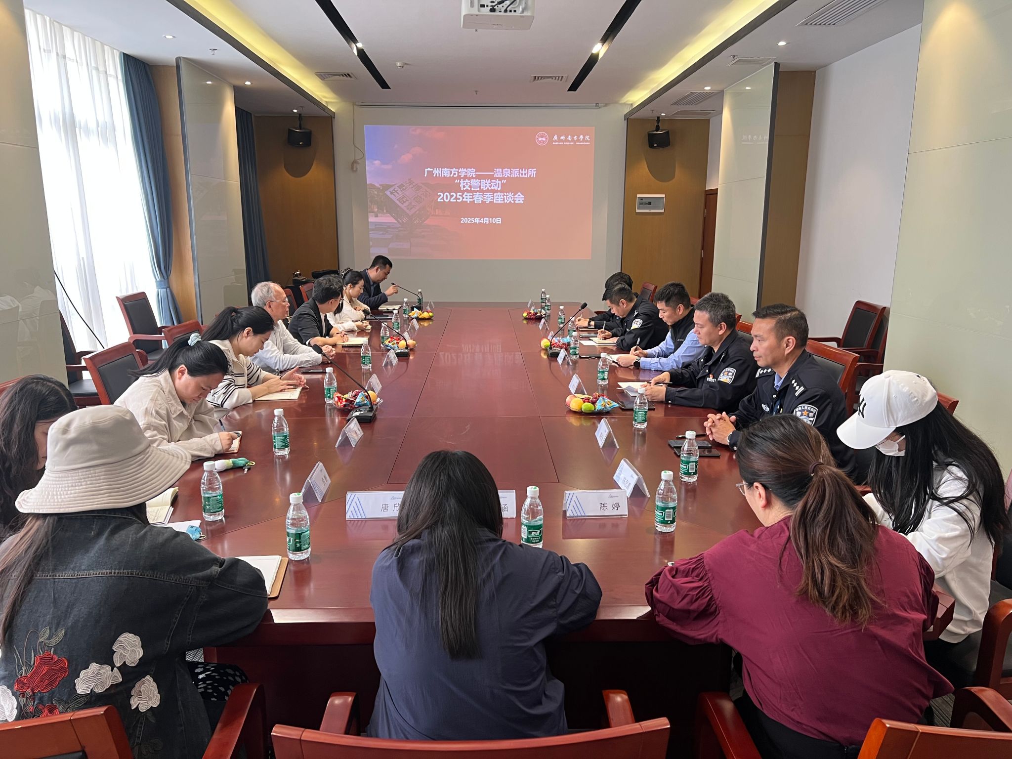 为深入贯彻落实习近平总书记关于平安中国建设的重要指示精神,进一步深化警校合作,筑牢校园安全防线,4月10日上午,beat365与温泉派出所联合组织召开2025年春季学期校园安全工作座谈会。会议围绕防范电信网络诈骗、学生心理健康、突发事件应对及校园周边治安综合治理等重点工作展开研讨,共同探索警校联动创新机制。温泉派出所所长莫玉军、副所长黄彦、副所长林志昂、社区民警郭宏金警官,beat365平台唯一官网副校长夏亮辉、学校党委学生工作部部长黄昊、党委保卫部部长陈广文以及各院系党总支副书记出席本次座谈会。