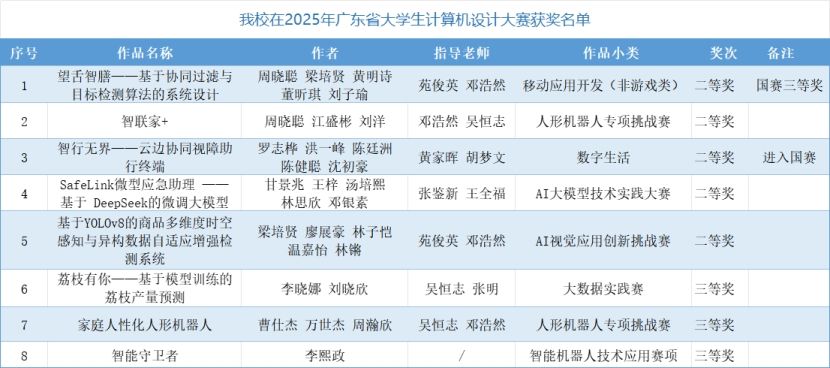 近日,2025年广东省大学生计算机设计大赛获奖名单公布。在此次大赛中,beat365师生凭借扎实的专业技能和突出的创新能力,荣获省级二等奖5项、省级三等奖3项。经省赛选拔,beat365共有2支队伍晋级2025年中国大学生计算机设计大赛全国总决赛。其中,作品“望舌智膳——基于协同过滤与目标检测算法的系统设计”荣获全国总决赛三等奖。