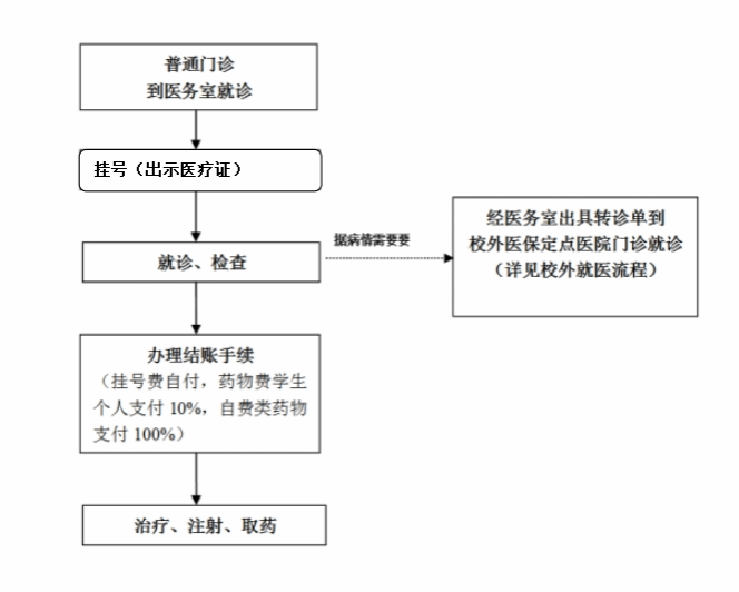 参保学生的普通门诊(急诊、特殊、慢性疾病及需要住院的除外)应首先到学院医务室就诊。