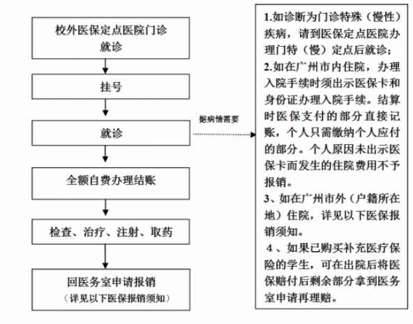 (2)住院:在广州地区住院,只需给医院出示电子医保凭证、社会保障卡或者居民身份证等基本医疗保险凭证,在医院享受直接减免.在广州地区以外住院,非急诊需先在微信小程序“粤医保”或“粤省事”异地住院备案(选临时),一般一个工作日或两个工作日就通过,查询通过后住院,也只需给医院出示医保卡、身份证,在医院享受直接减免,急诊入院不需备案,未备案或备案未联网在出院后2个月内将报销材料交至学校医务室104房,经医务室审核无误后送广州医疗保险服务中心经办机构报销